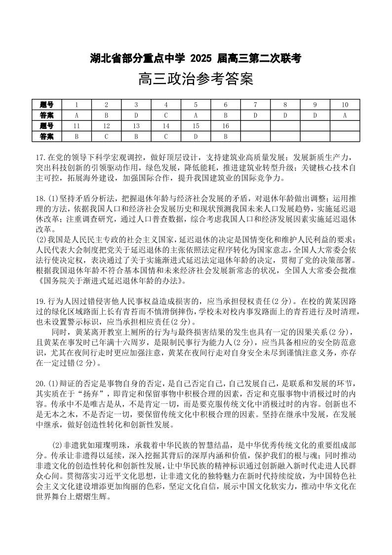 湖北省重点中学2024-2025学年上学期1月 高三第二次联考政治答案