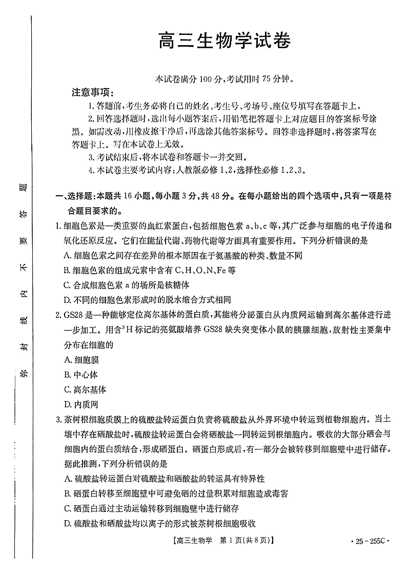 甘肃省区域高中2024-2025学年上学期1月高三联考生物