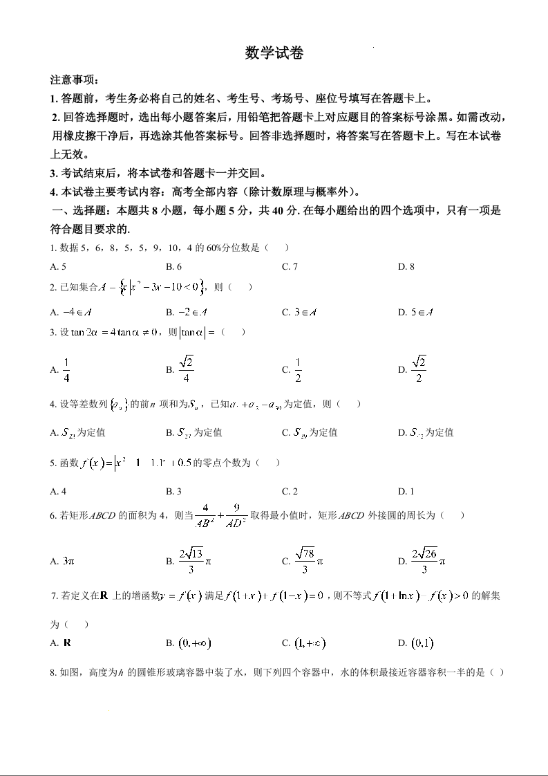 辽宁省抚顺市省重点高中六校协作体2025届高三上学期1月期末考试(二模)数学+答案