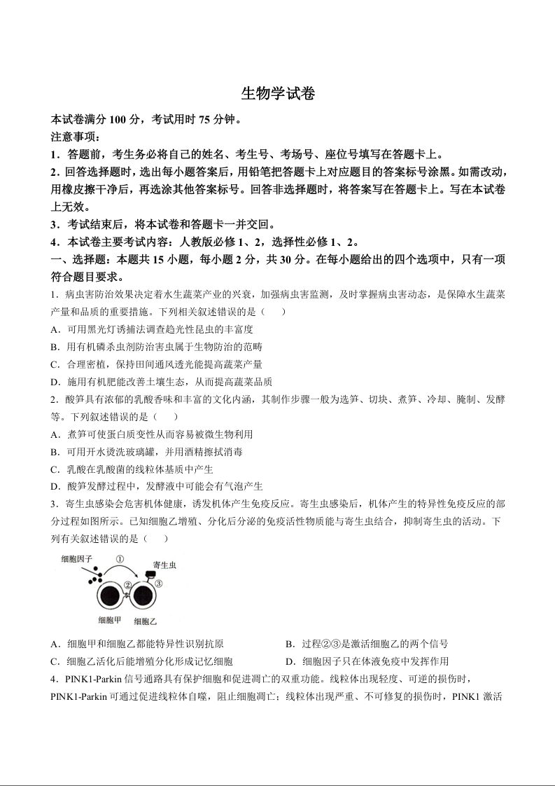 辽宁省抚顺市省重点高中六校协作体2025届高三上学期1月期末考试(二模)生物+答案