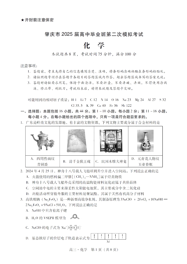 广东省肇庆市2024-2025学年上学期高三第二次模拟考试(期末)化学+答案