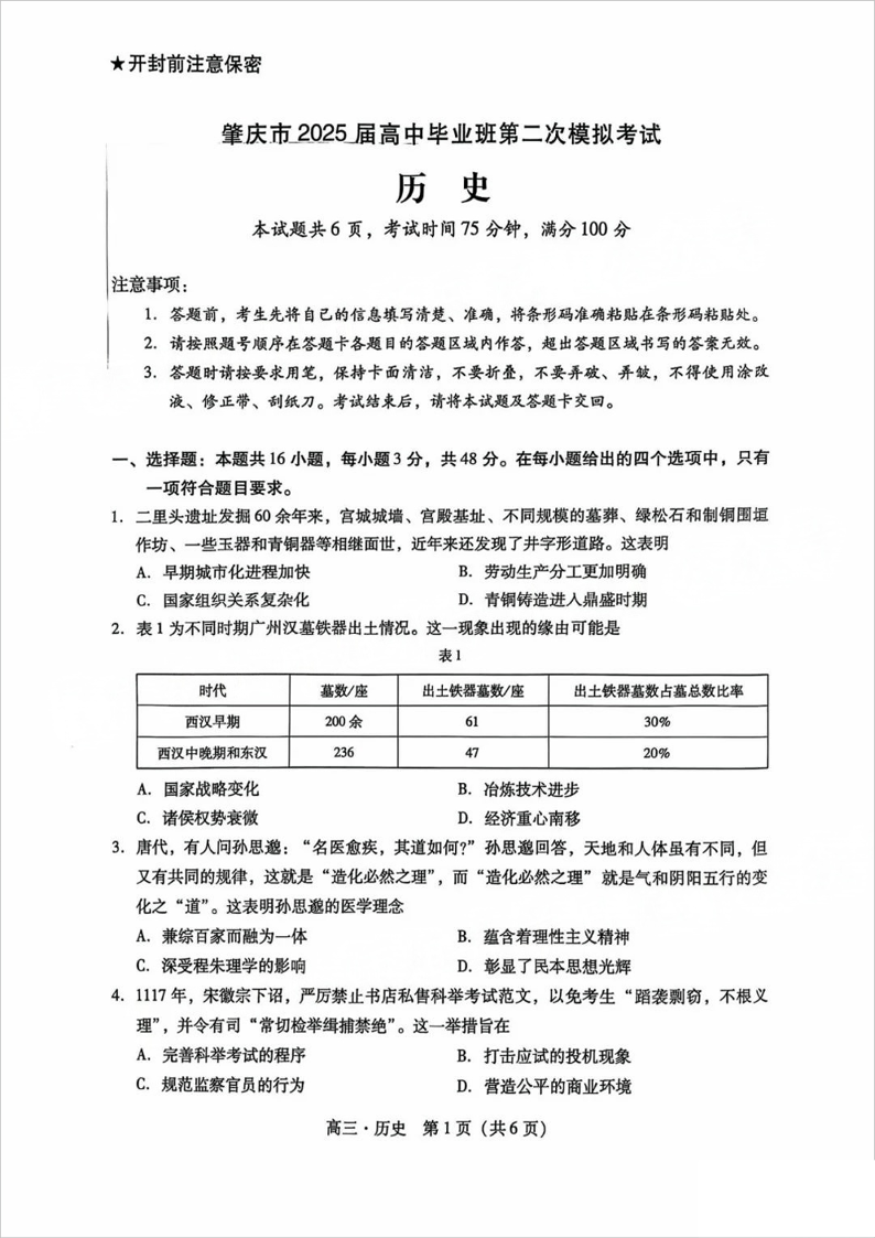 广东省肇庆市2024-2025学年上学期高三第二次模拟考试(期末)历史