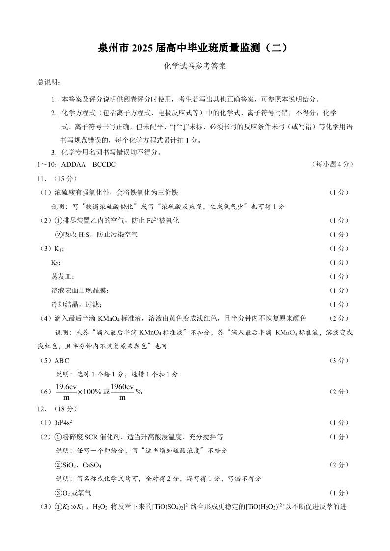 福建省泉州市2024-2025学年上学期高中毕业班质量监测(二)化学答案