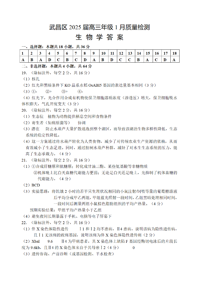 湖北省武汉市武昌区2024-2025学年上学期1月高三期末质量检测生物答案