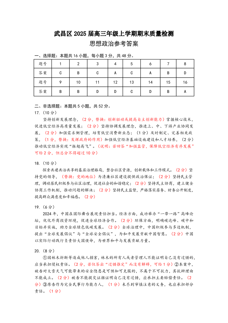 湖北省武汉市武昌区2024-2025学年上学期1月高三期末质量检测政治答案