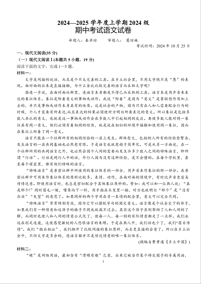 湖北省沙市中学2024—2025学年度上学期2024级期中考试语文