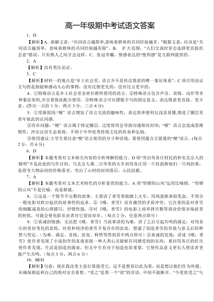 湖北省沙市中学2024—2025学年度上学期2024级期中考试语文答案