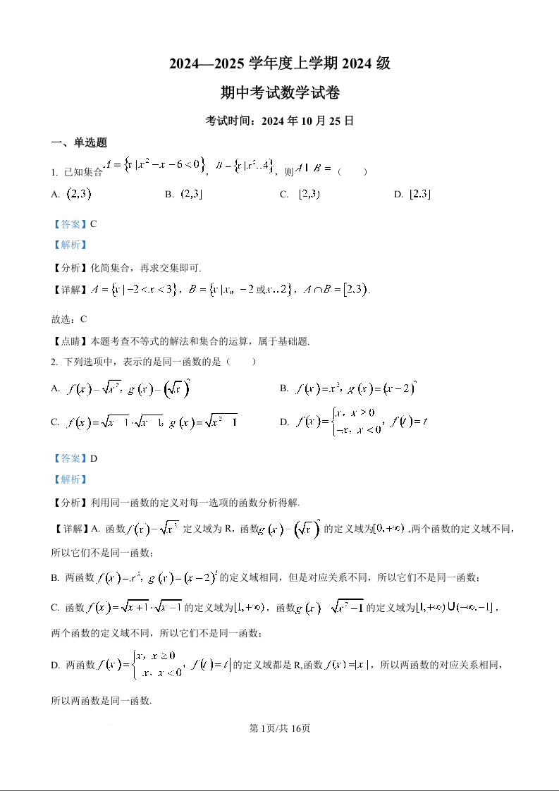 湖北省沙市中学2024—2025学年度上学期2024级期中考试数学(解析版)