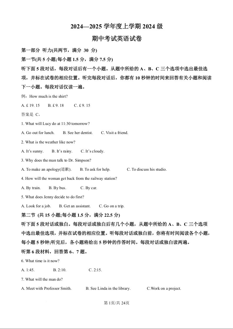 湖北省沙市中学2024—2025学年度上学期2024级期中考试英语(解析版)