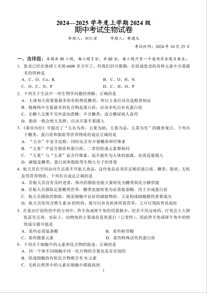 湖北省沙市中学2024—2025学年度上学期2024级期中考试生物+答案