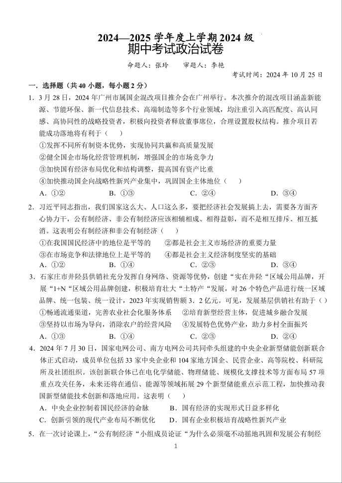 湖北省沙市中学2024—2025学年度上学期2024级期中考试政治