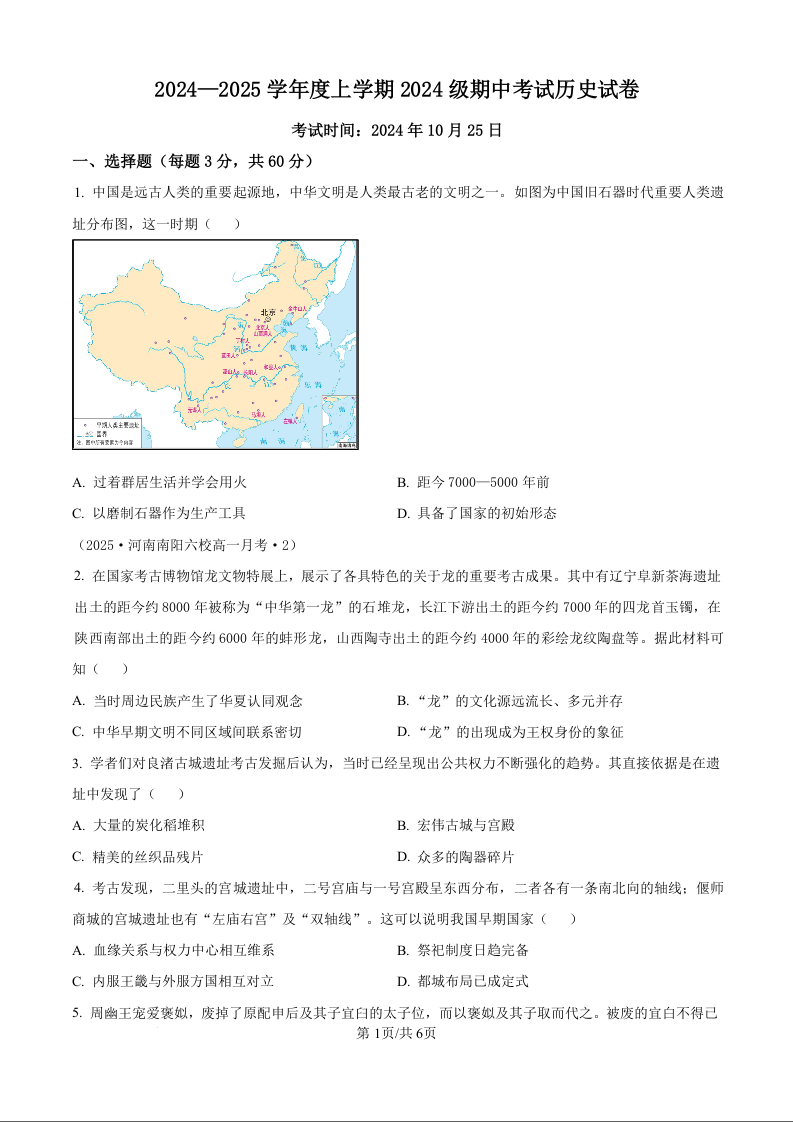 湖北省沙市中学2024—2025学年度上学期2024级期中考试历史(原卷版)