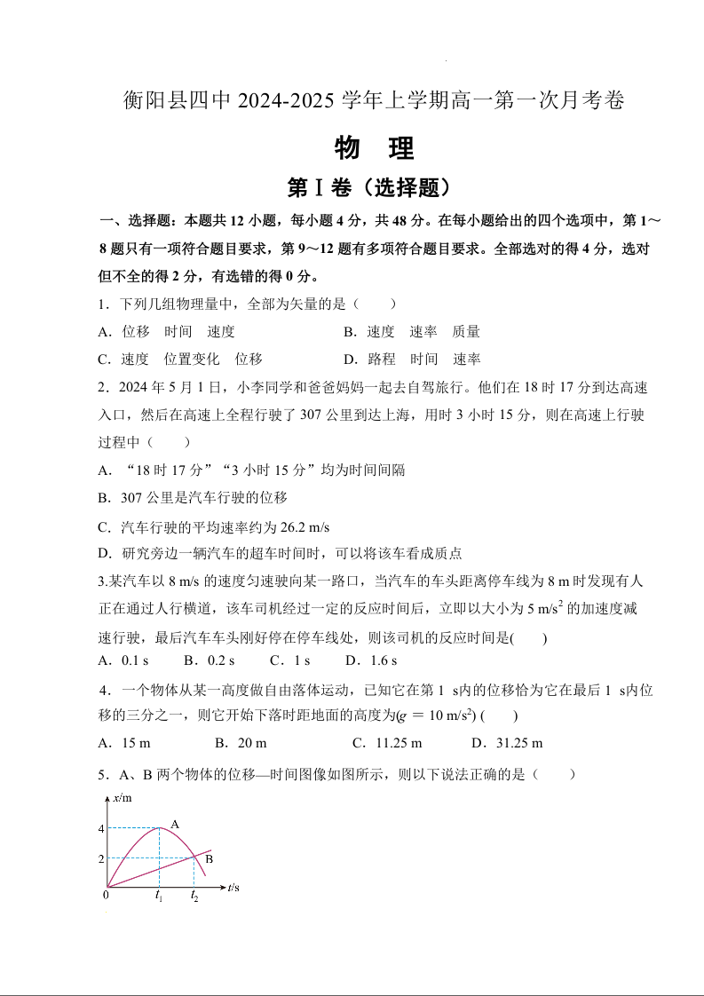 湖南省衡阳市衡阳县四中2024-2025学年上学期高一第一次月考卷物理+答案