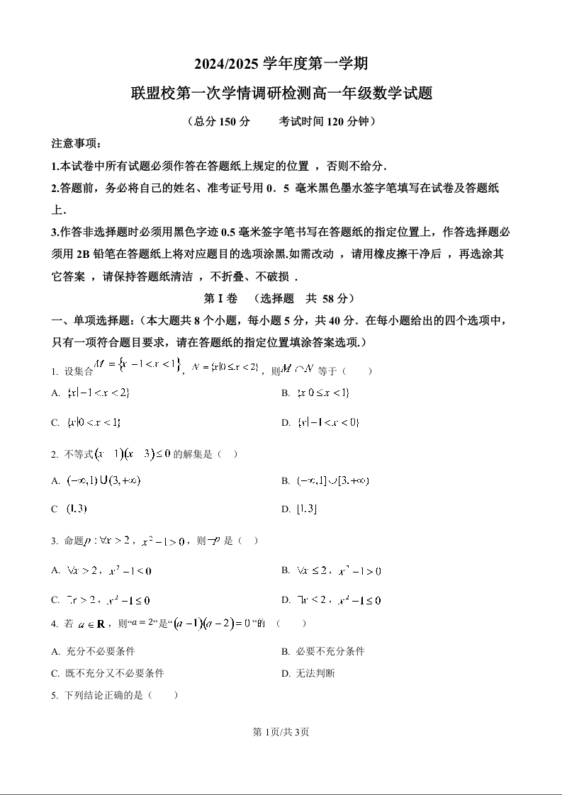 江苏省盐城市五校联考2024-2025学年度第一学期联盟校第一次学情调研检测数学(原卷版)