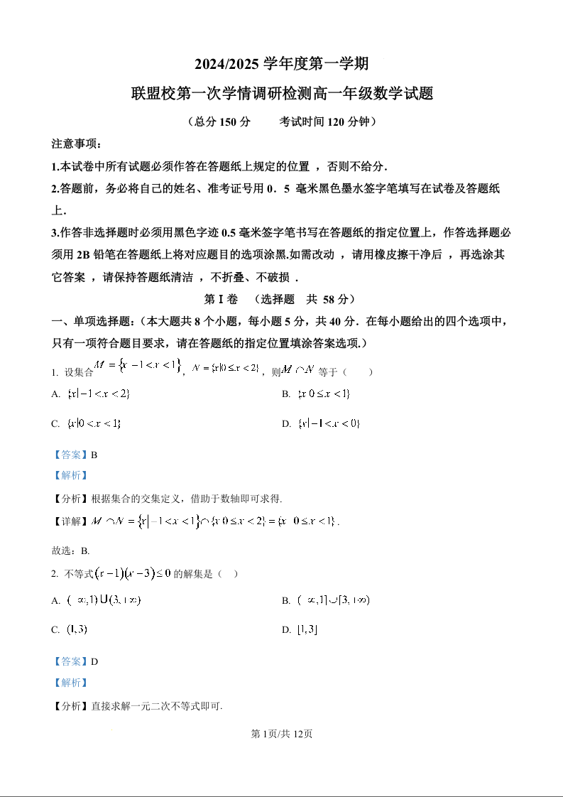 江苏省盐城市五校联考2024-2025学年度第一学期联盟校第一次学情调研检测数学(解析版)