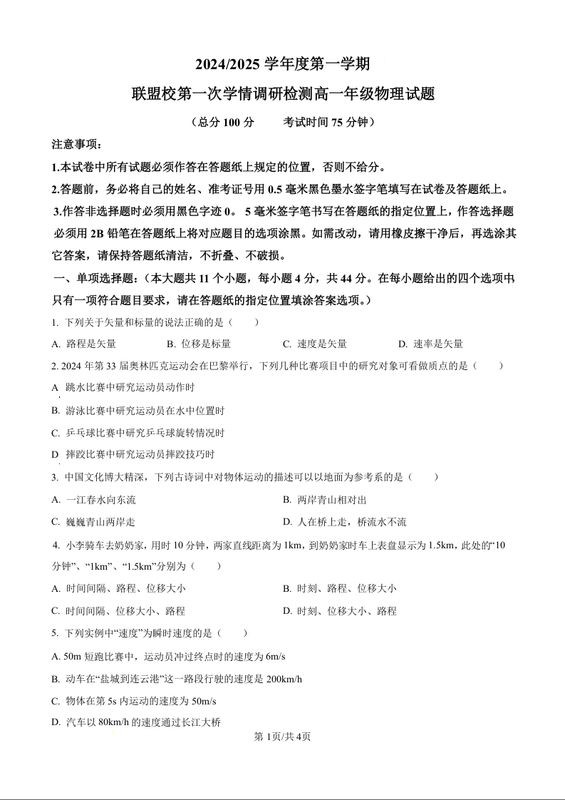 江苏省盐城市五校联考2024-2025学年度第一学期联盟校第一次学情调研检测物理(原卷版)