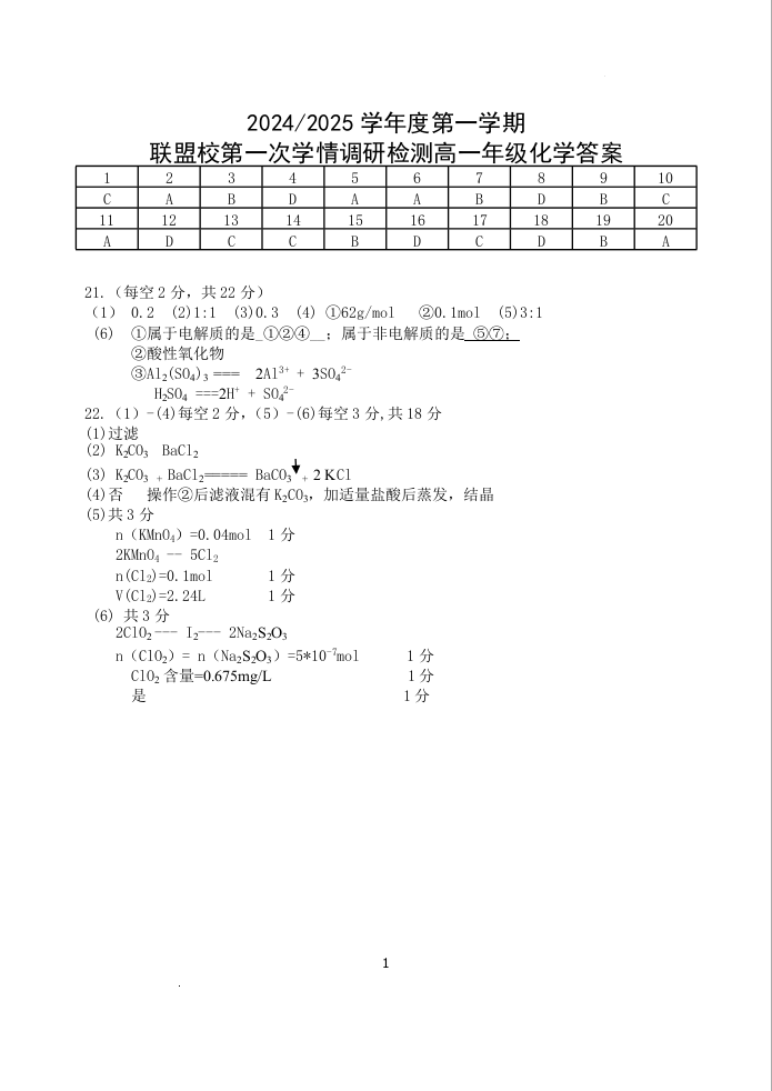 江苏省盐城市五校联考2024-2025学年度第一学期联盟校第一次学情调研检测化学答案