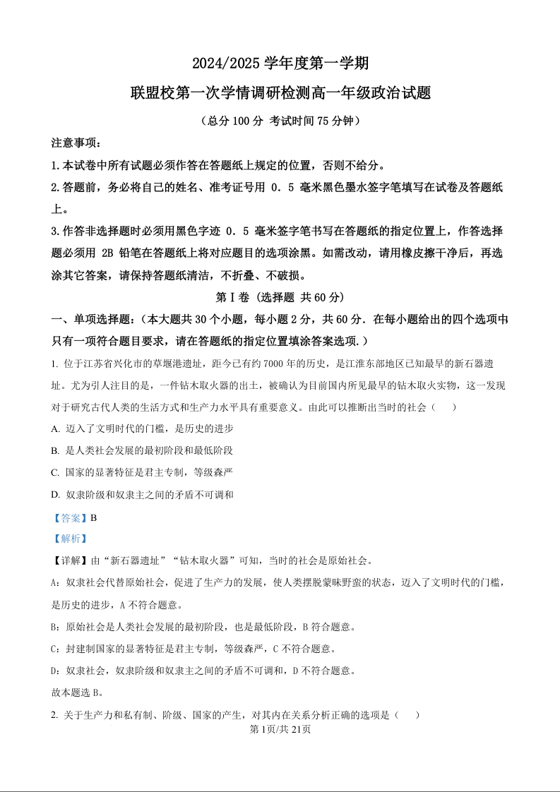 江苏省盐城市五校联考2024-2025学年度第一学期联盟校第一次学情调研检测政治(解析版)