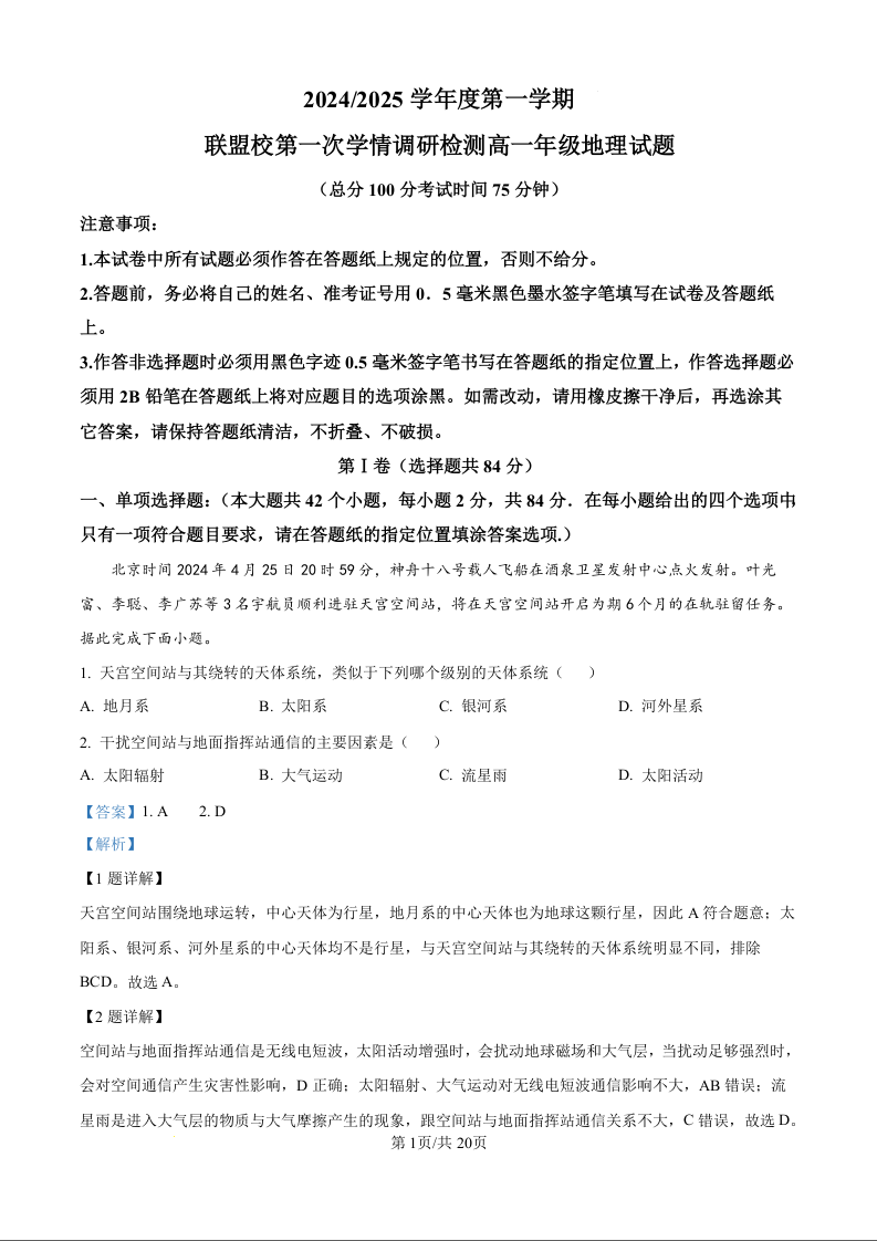 江苏省盐城市五校联考2024-2025学年度第一学期联盟校第一次学情调研检测地理(解析版)