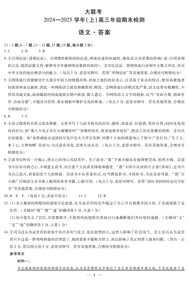 河南省天一大联考2025届高三上学期1月期末考试语文答案
