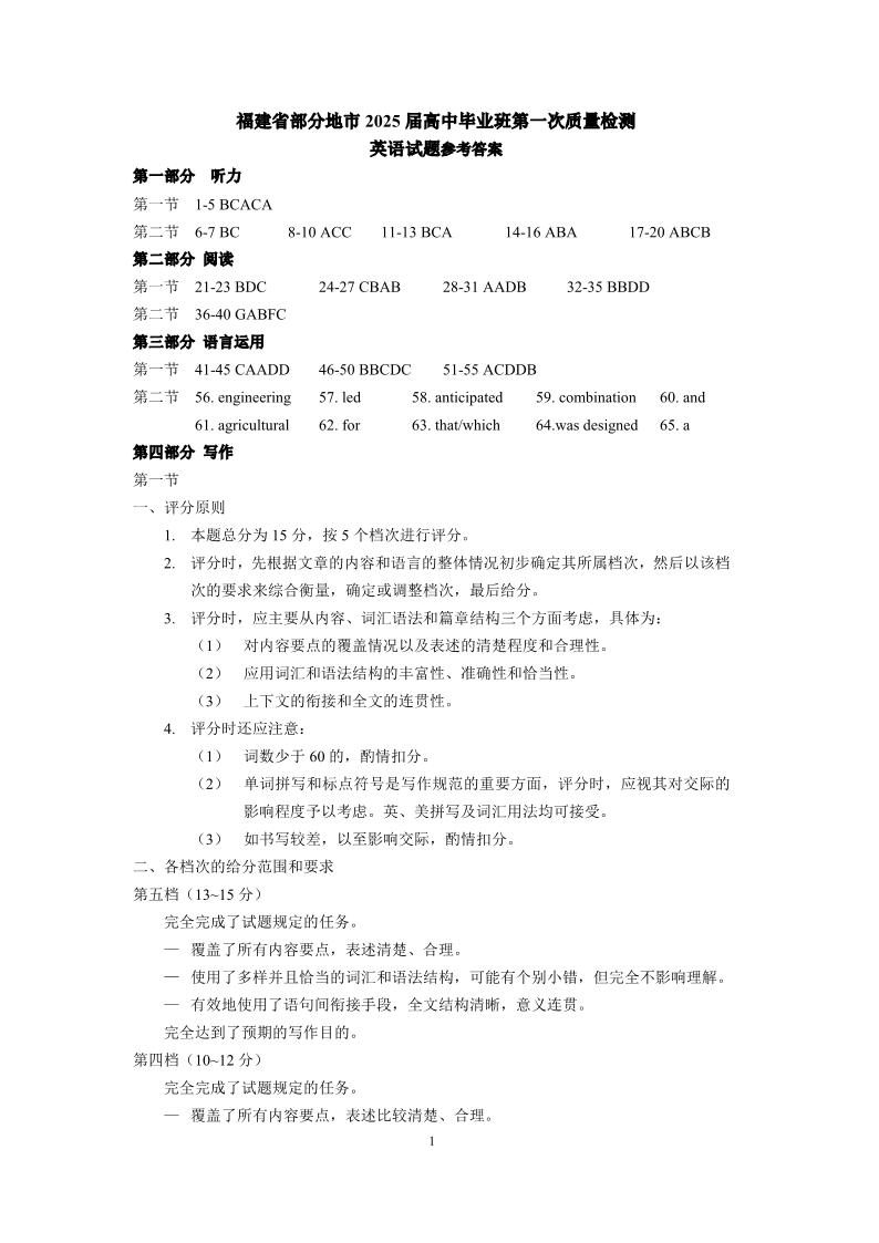 福建省六市2025届高中毕业班第一次质量检测(一模)英语答案