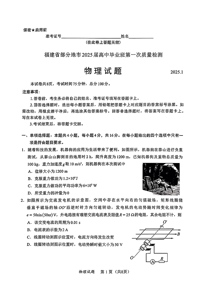 福建省六市2025届高中毕业班第一次质量检测(一模)物理