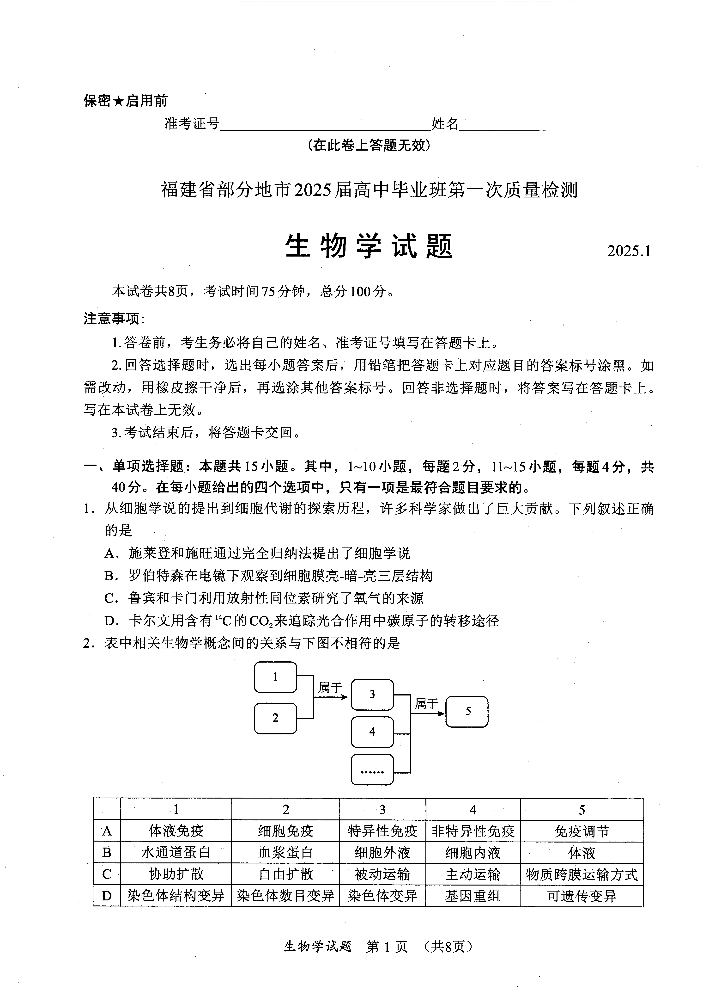 福建省六市2025届高中毕业班第一次质量检测(一模)生物