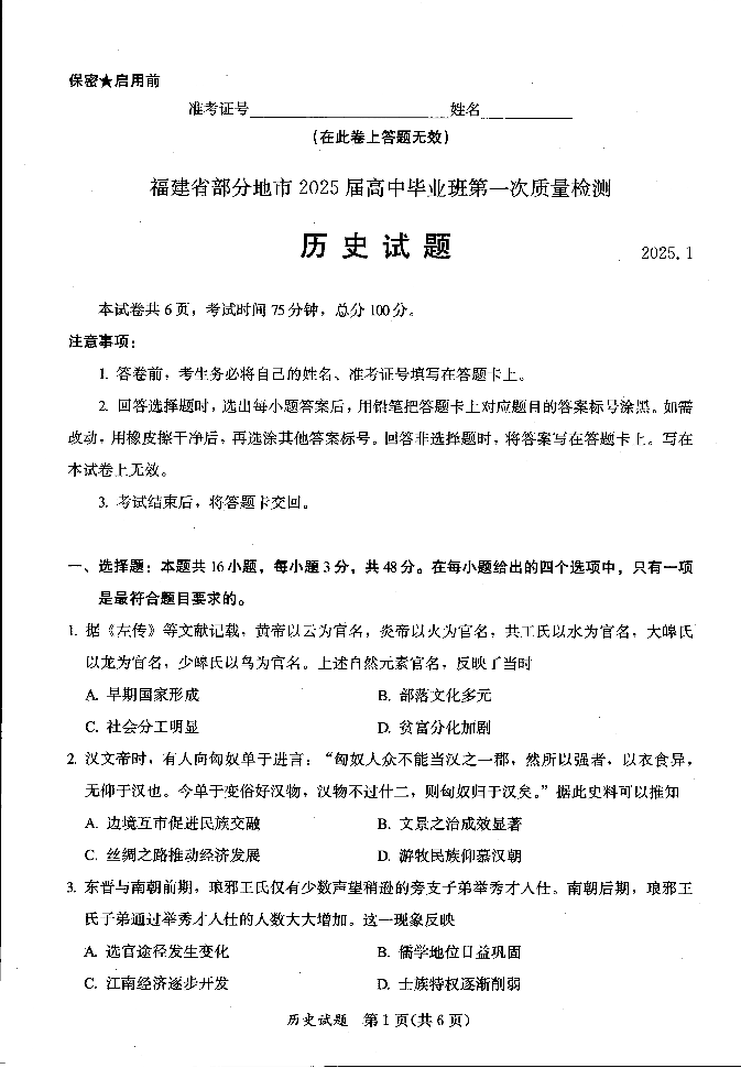 福建省六市2025届高中毕业班第一次质量检测(一模)历史