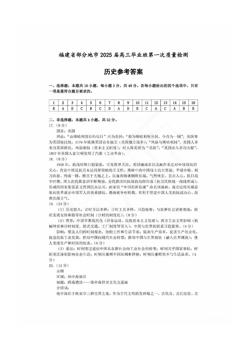 福建省六市2025届高中毕业班第一次质量检测(一模)历史答案