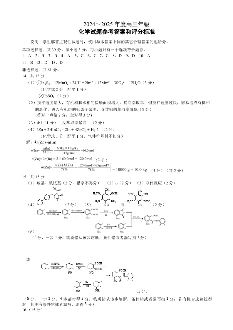 江苏省苏北四市(徐宿淮连) 2025届高三第一次调研测试化学答案