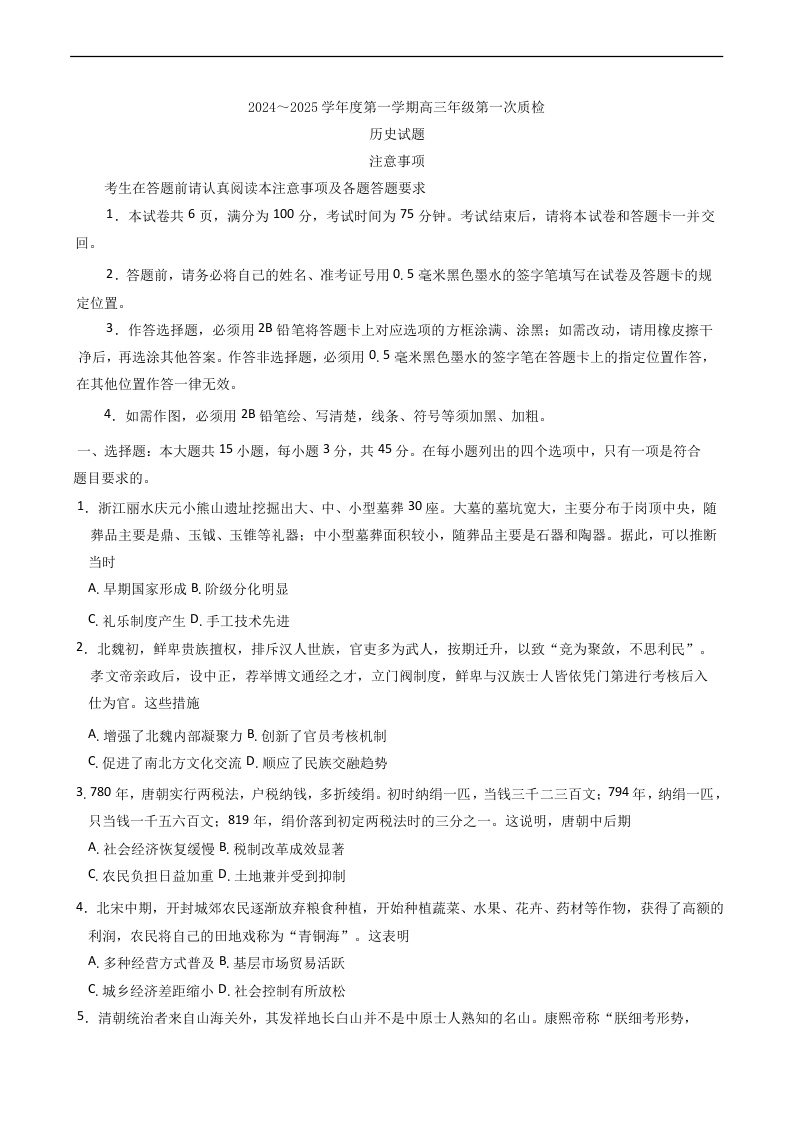 江苏省苏北四市(徐宿淮连) 2025届高三第一次调研测试历史+答案