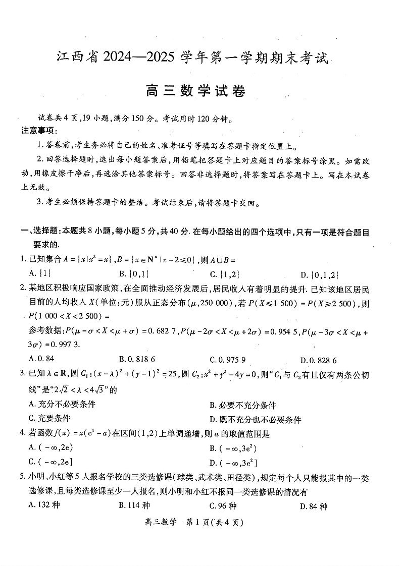 江西省部分高中2025届高三上学期1月期末教学质量检测数学