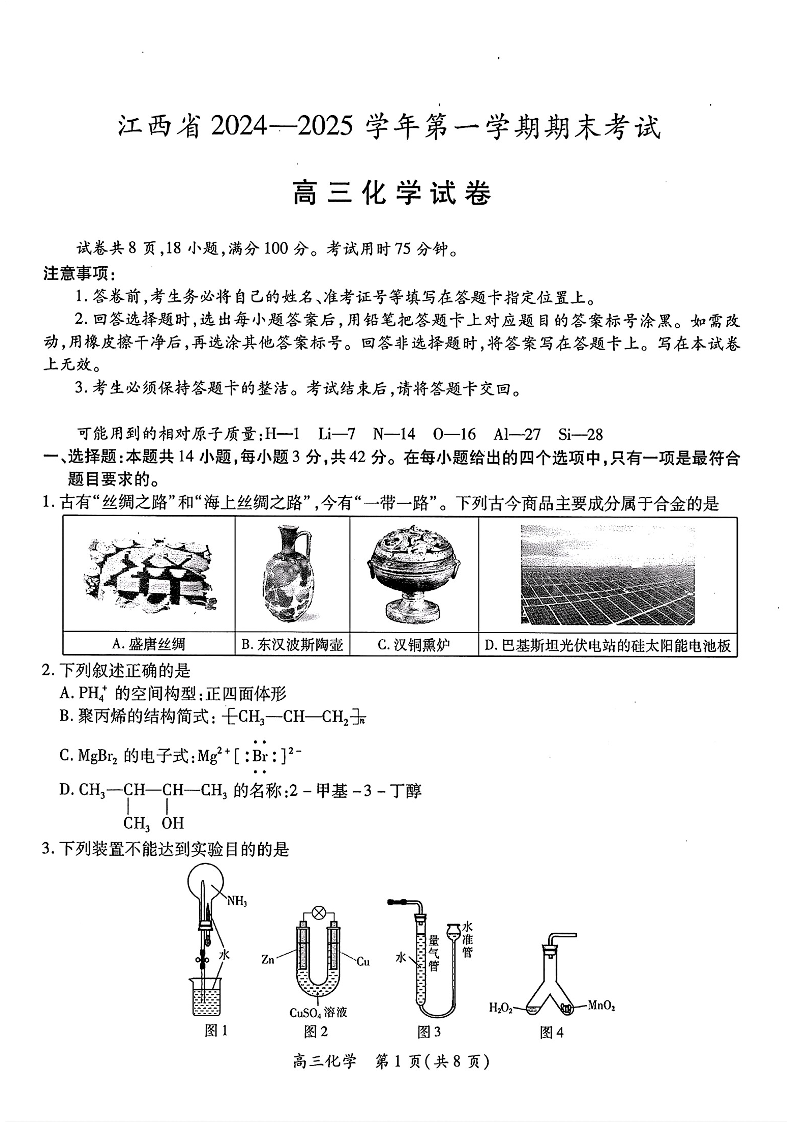 江西省部分高中2025届高三上学期1月期末教学质量检测化学+答案