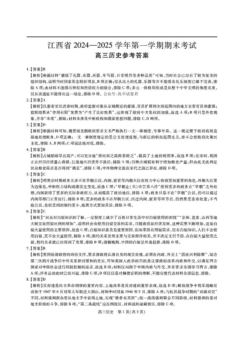 江西省部分高中2025届高三上学期1月期末教学质量检测历史答案
