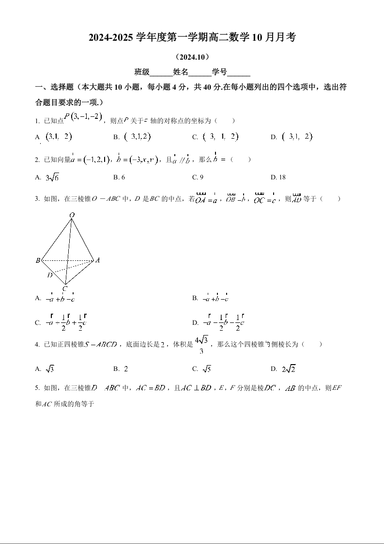 北京理工大学附属中学2024-2025学年度高二年级10月月考数学 (原卷版)