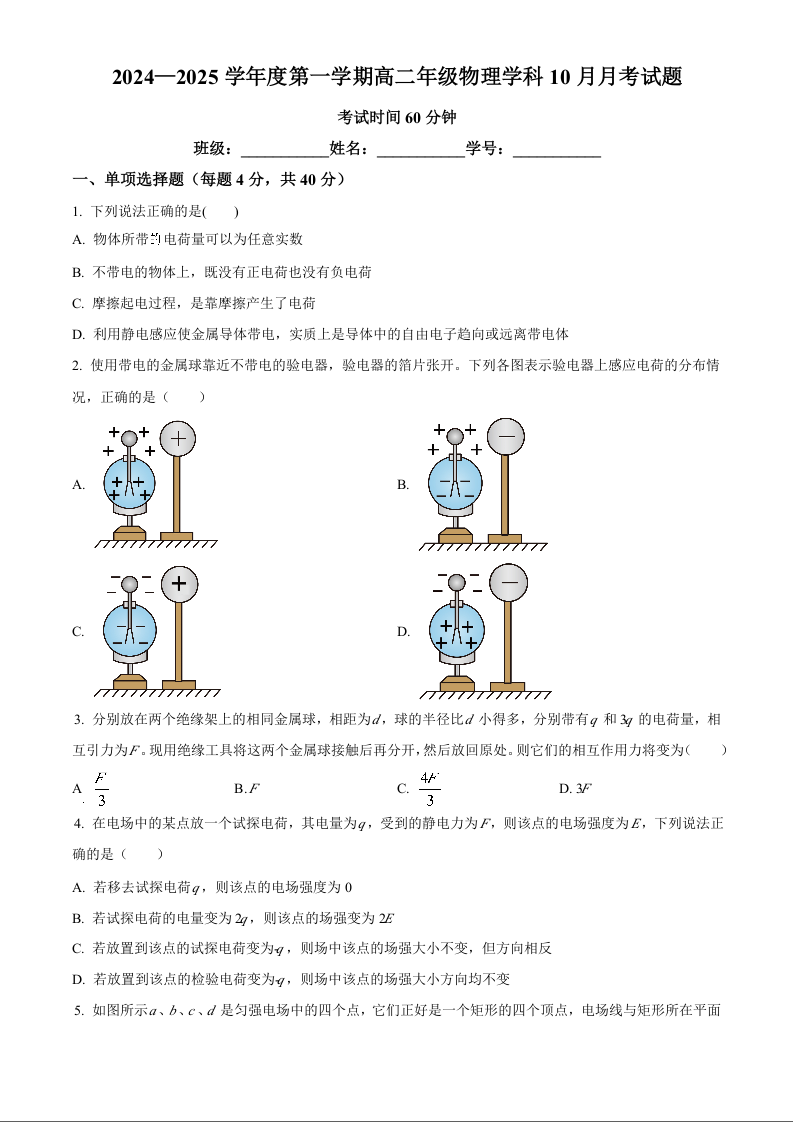 北京理工大学附属中学2024-2025学年度高二年级10月月考物理(原卷版)