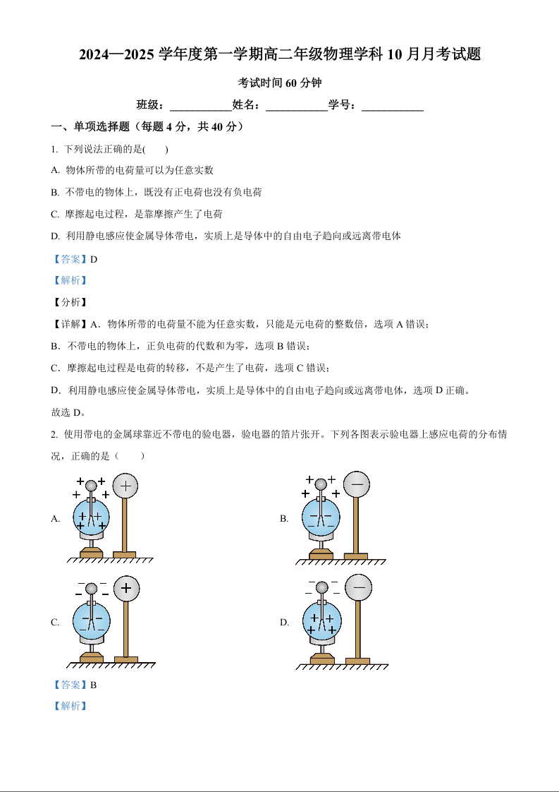 北京理工大学附属中学2024-2025学年度高二年级10月月考物理(解析版)