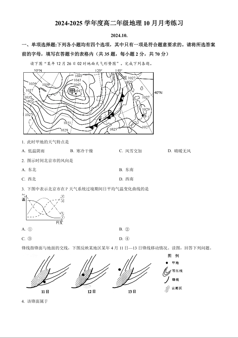 北京理工大学附属中学2024-2025学年度高二年级10月月考地理(原卷版)