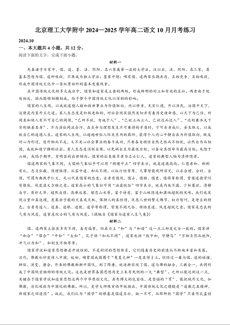 北京市海淀区北京理工大学附属中学2024—2025学年度第一学期高二年10月月考语文