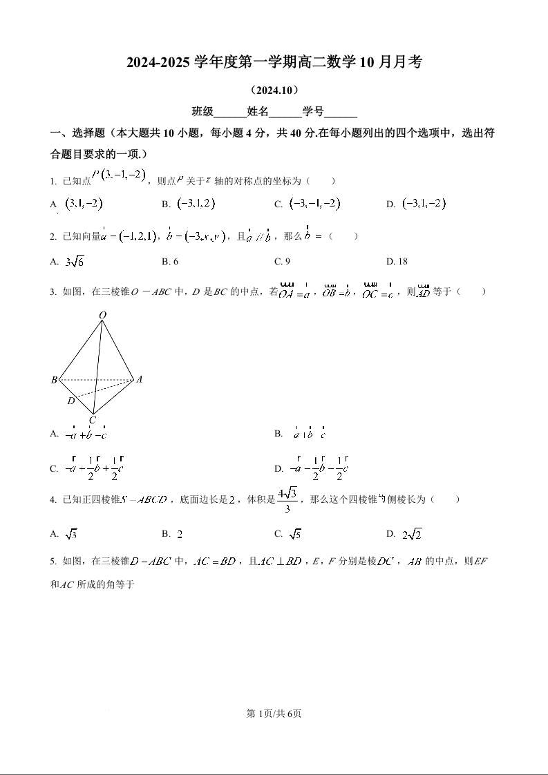 北京市海淀区北京理工大学附属中学2024—2025学年度第一学期高二年10月月考数学(原卷版)