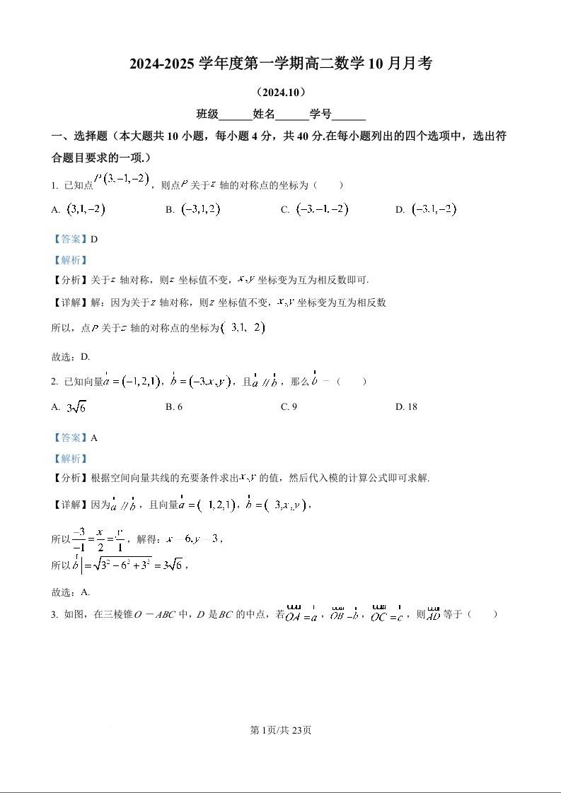 北京市海淀区北京理工大学附属中学2024—2025学年度第一学期高二年10月月考数学(解析版)