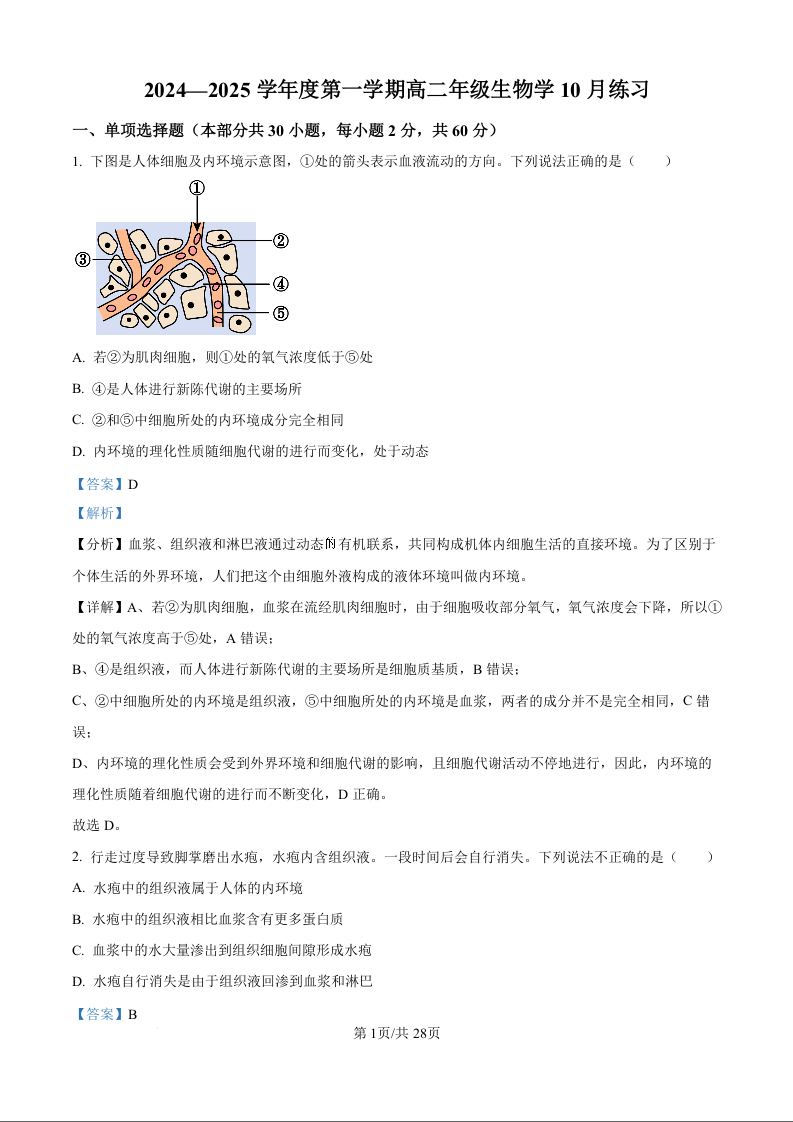 北京市海淀区北京理工大学附属中学2024—2025学年度第一学期高二年10月月考生物(解析版)