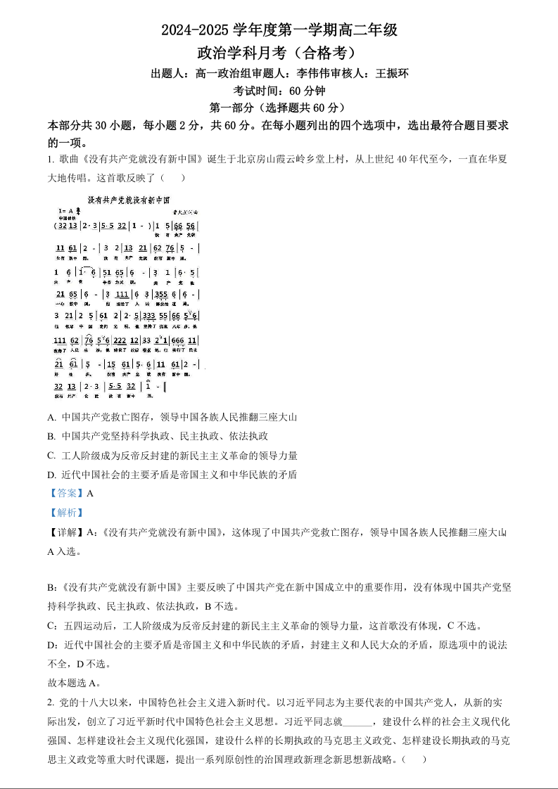 北京市海淀区北京理工大学附属中学2024—2025学年度第一学期高二年10月月考政治(解析版)