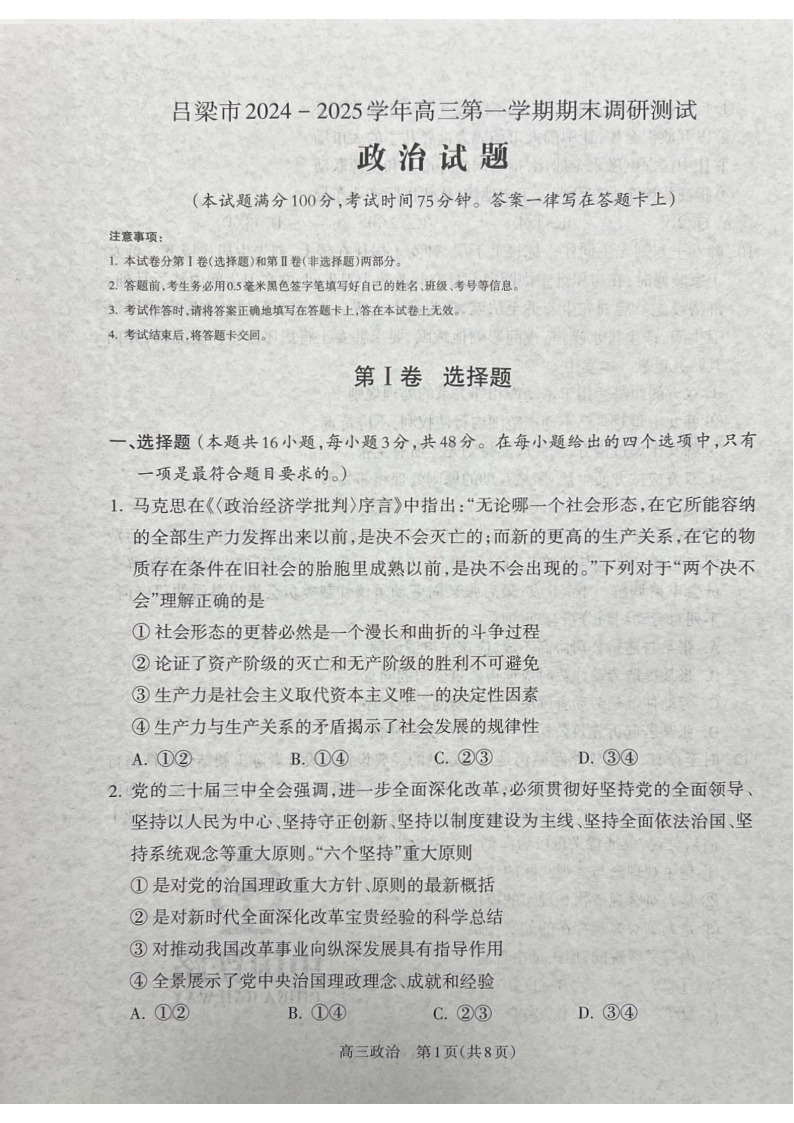 山西省吕梁市2025届高三上学期1月期末调研考试政治