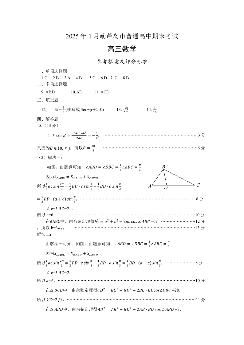 辽宁省葫芦岛市2025届高三上学期1月期末考试数学答案