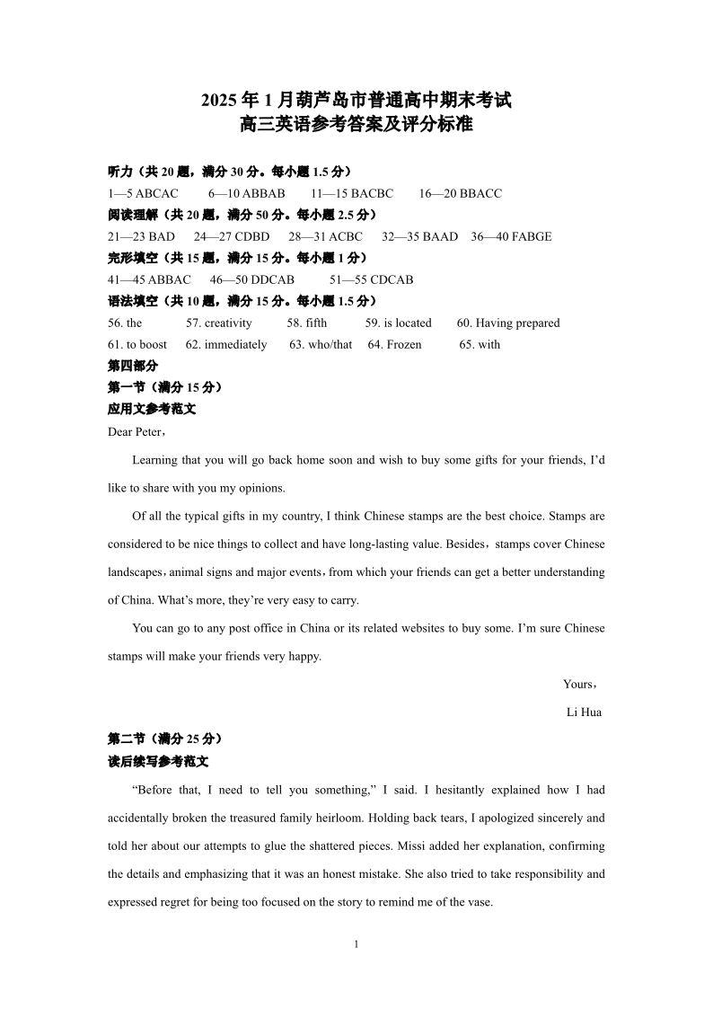 辽宁省葫芦岛市2025届高三上学期1月期末考试英语答案