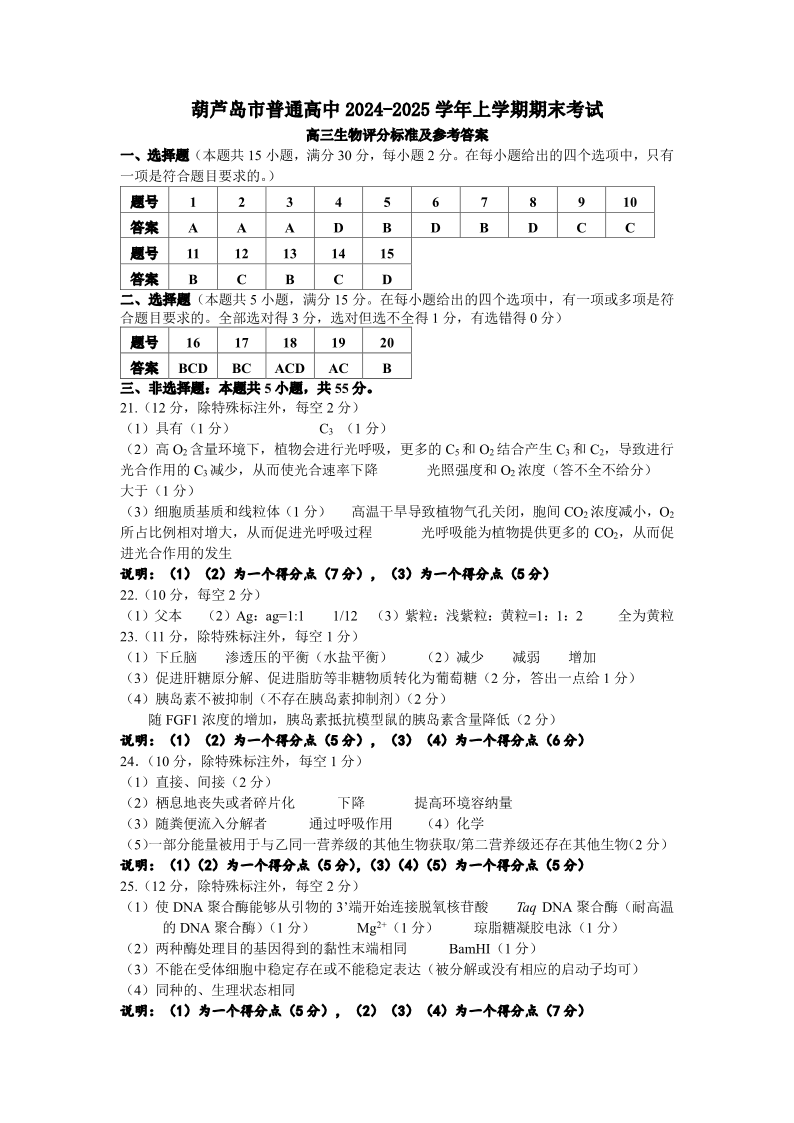 辽宁省葫芦岛市2025届高三上学期1月期末考试生物答案