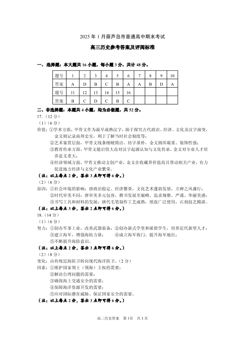 辽宁省葫芦岛市2025届高三上学期1月期末考试历史答案