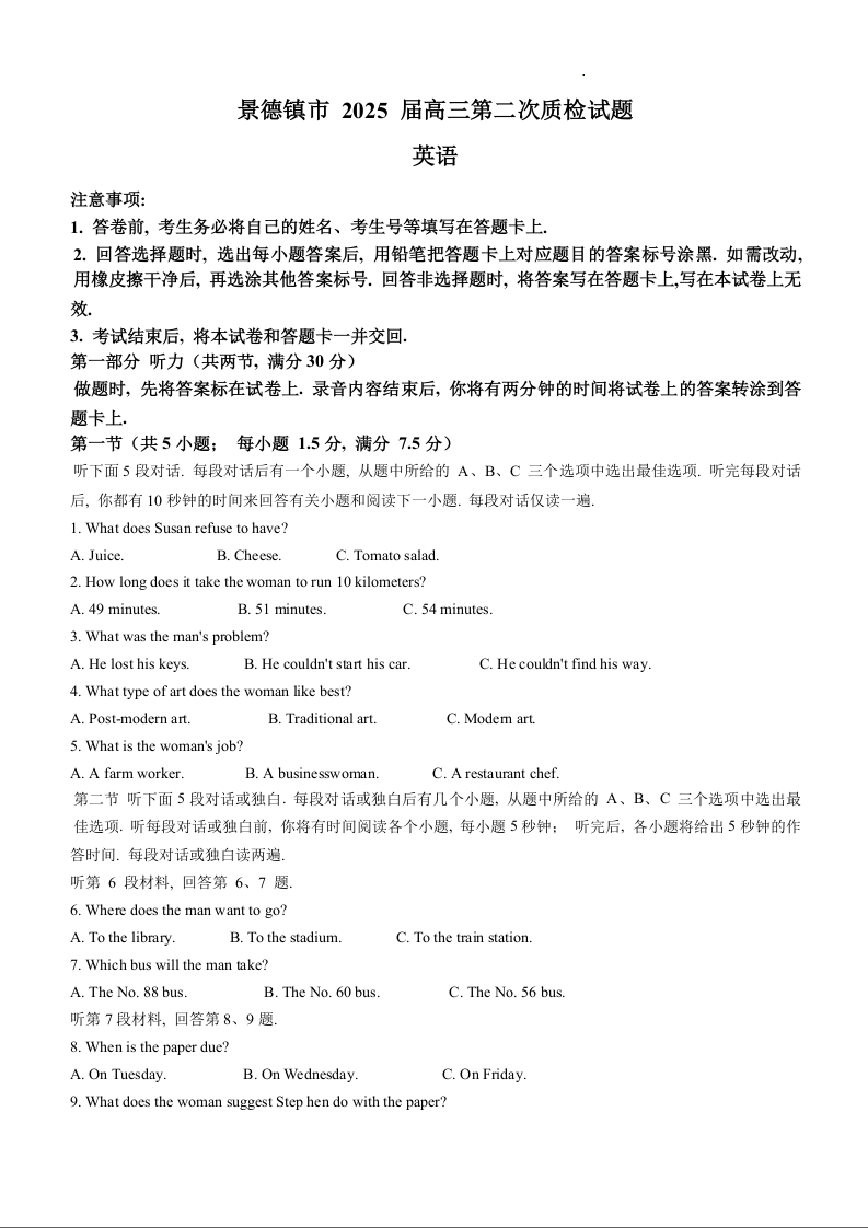 江西省景德镇市2025届高三上学期1月第二次质量检测(二模)英语+答案