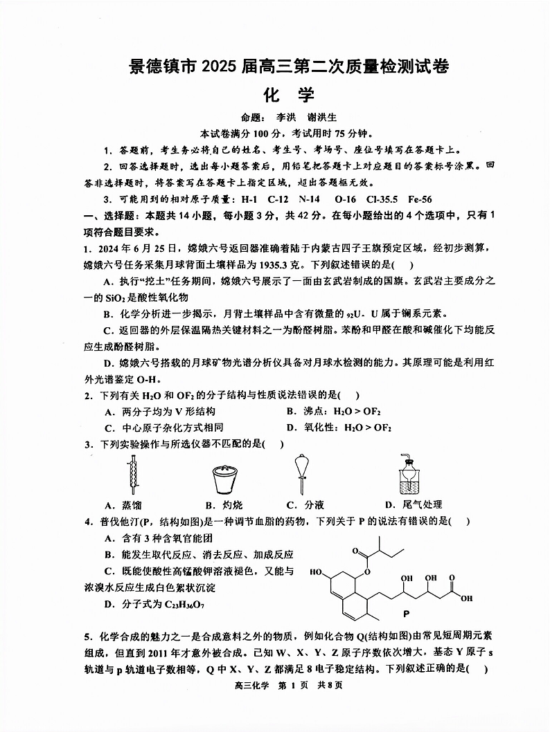 江西省景德镇市2025届高三上学期1月第二次质量检测(二模)化学+答案